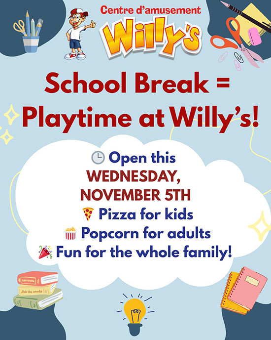 Willy’s! is a family amusement center located in Pointe-Claire, directly in front of Fairview shopping center in the West Island. We are a short drive away from Vaudreuil, Rigaud, Valleyfield, Île-Perrot, Hudson, Saint-lazare, and Laval!